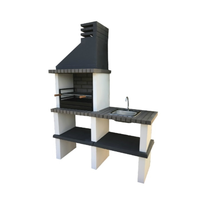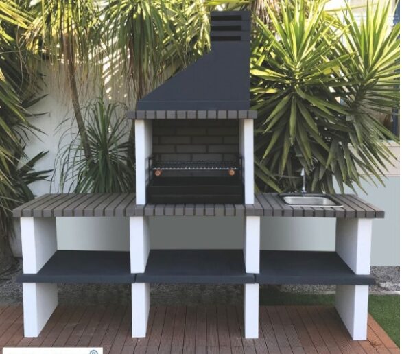 Churrasqueira Camping com bancada de lava loiças e fogão.A Churrasqueira Connect da Nesh é feita com materiais de alta qualidade, como betão pintado a preto e branco e tijolo refratário cinza. Equipada com grelha em aço, gaveta para recolha de cinzas, braseiro para lenha e carvão, e chaminé para melhor extração de fumos, oferece uma experiência completa de grelhados.