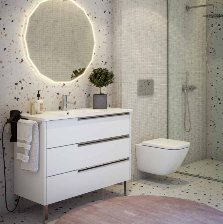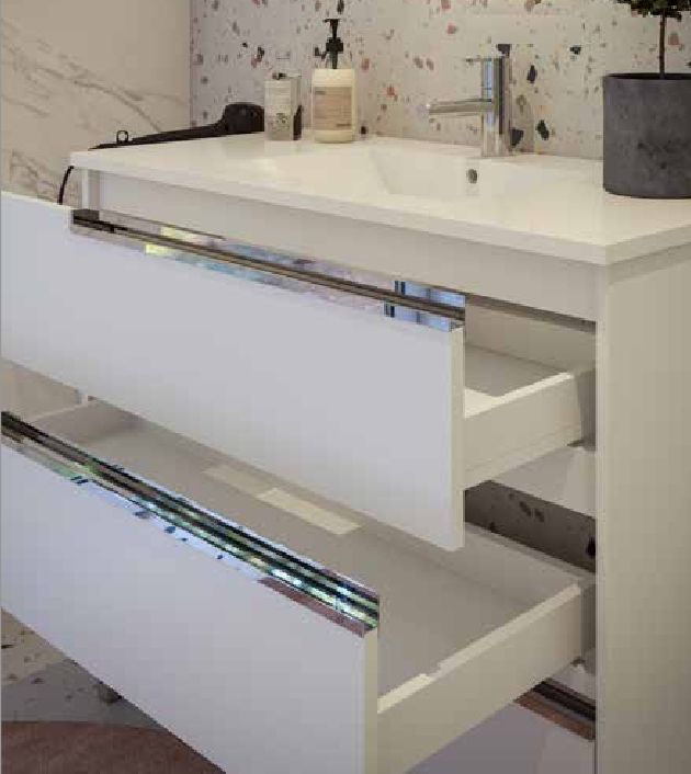 - Gavetões: Equipado com 3 gavetões espaçosos, o Bahía oferece ampla capacidade de armazenamento para organizar os seus produtos de higiene pessoal e acessórios de casa de banho.