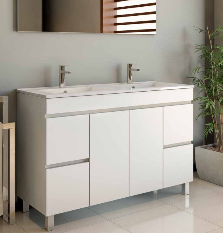 - L120 x A81 x P45 cm: Estrutura com 2 portas + 4 gavetas, Posição do Lavatório ao Centro.