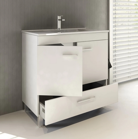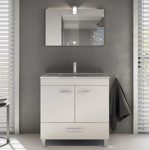 - L80 x A81 x P45 cm: Estrutura com 2 portas + 1 gaveta, Posição do Lavatório ao Centro.