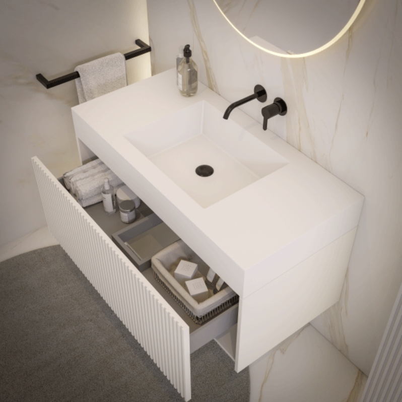 Móvel New Ripper com TampoMóvel suspenso de casa de banho em MDF com 1 gaveta espaçosa, sistema soft close e fixação regulável. Disponível em vários tamanhos e acabamentos mate ou brilho.