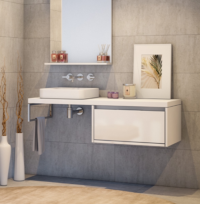 Móvel New Ripper com TampoMóvel suspenso de casa de banho em MDF com 1 gaveta espaçosa, sistema soft close e fixação regulável. Disponível em vários tamanhos e acabamentos mate ou brilho.