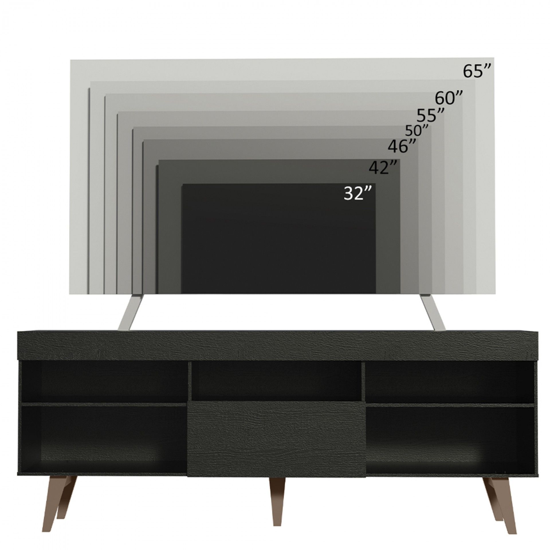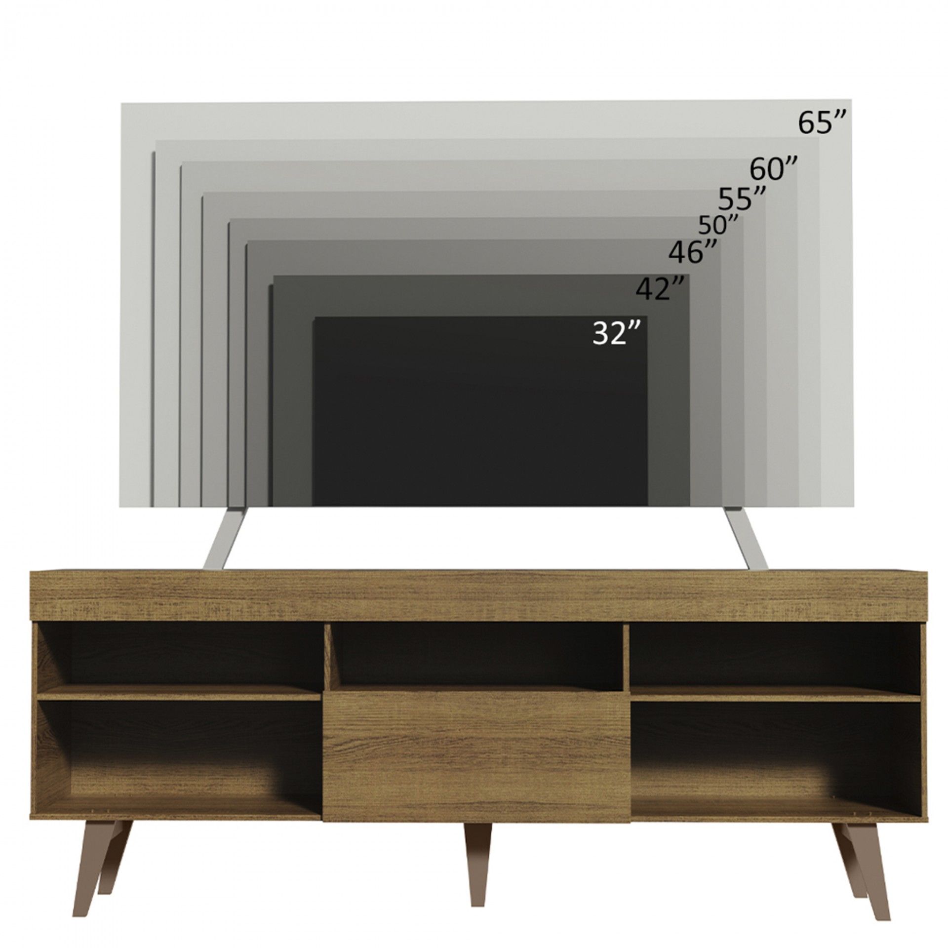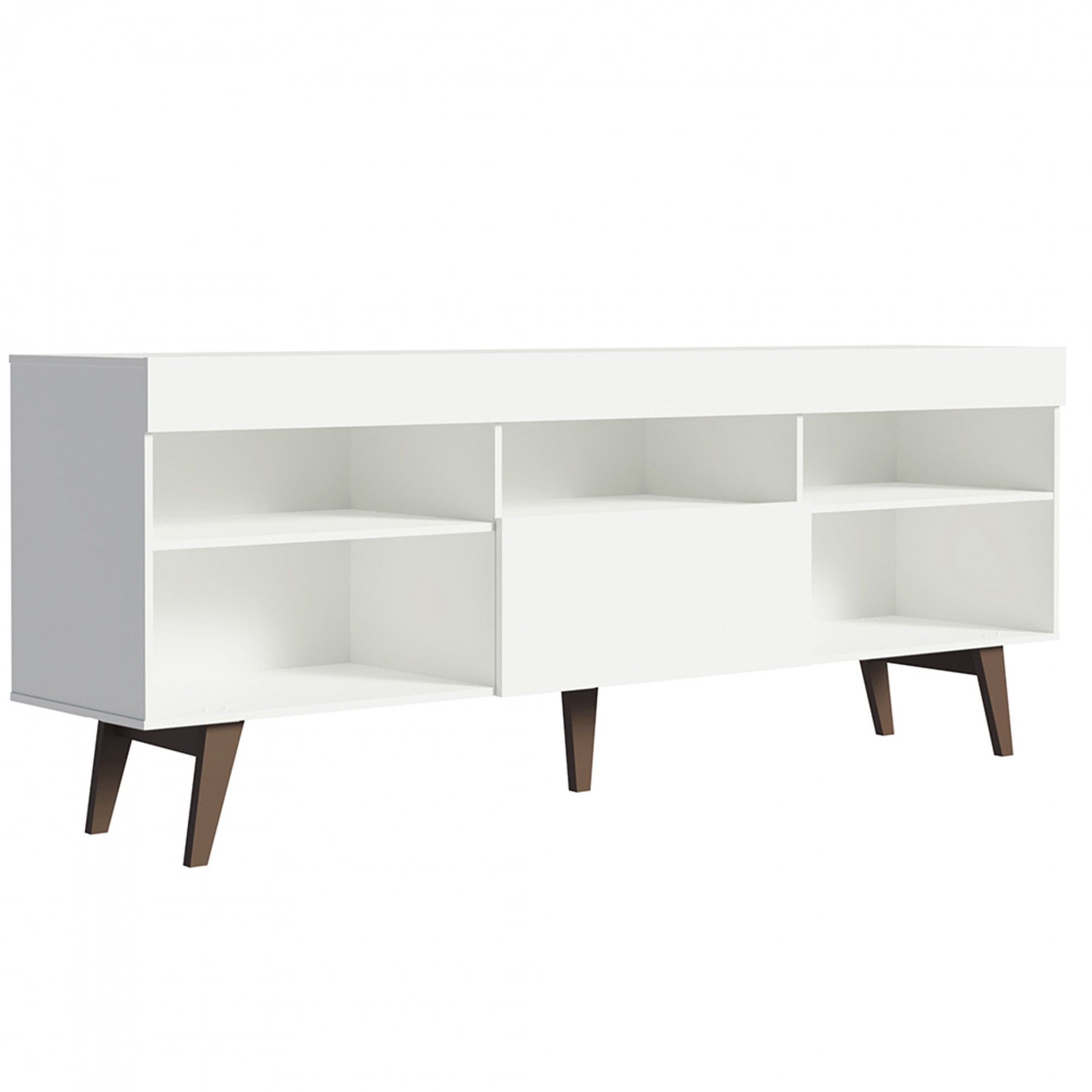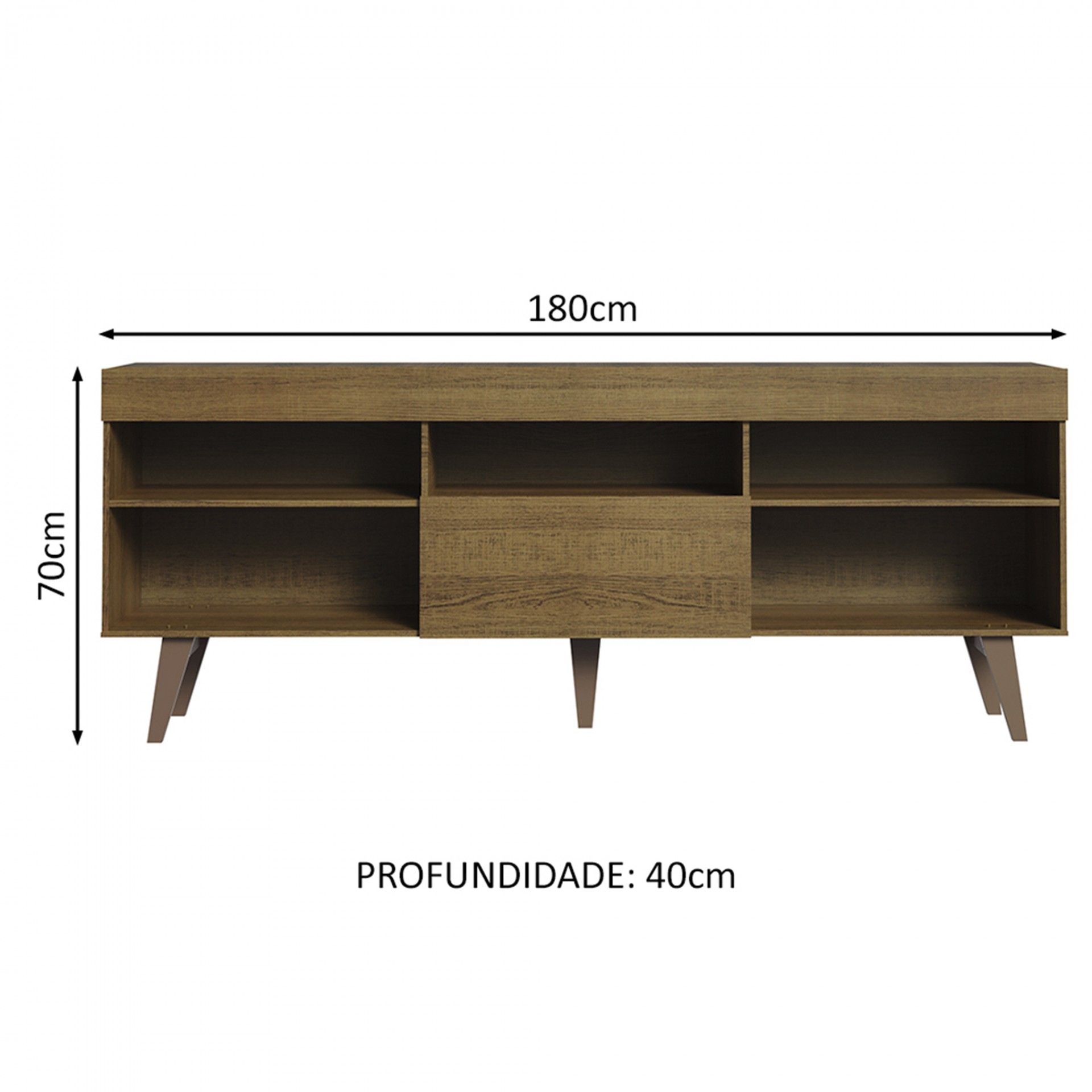 Móvel TV Odense com 180 cm de largura, ideal para TVs até 65”. Fabricado em aglomerado termoprensado, oferece nichos abertos e porta basculante para arrumação. Design moderno, funcional e com entrega em até 10 dias.