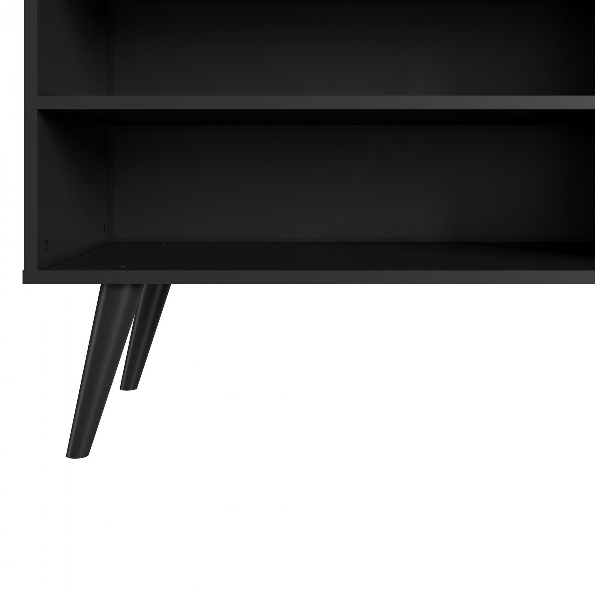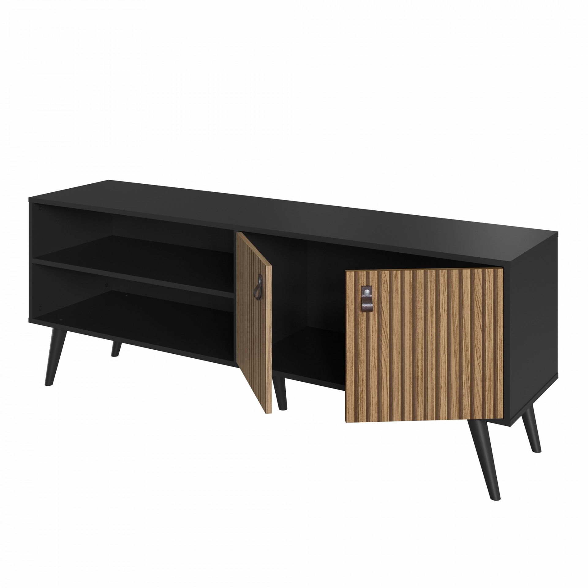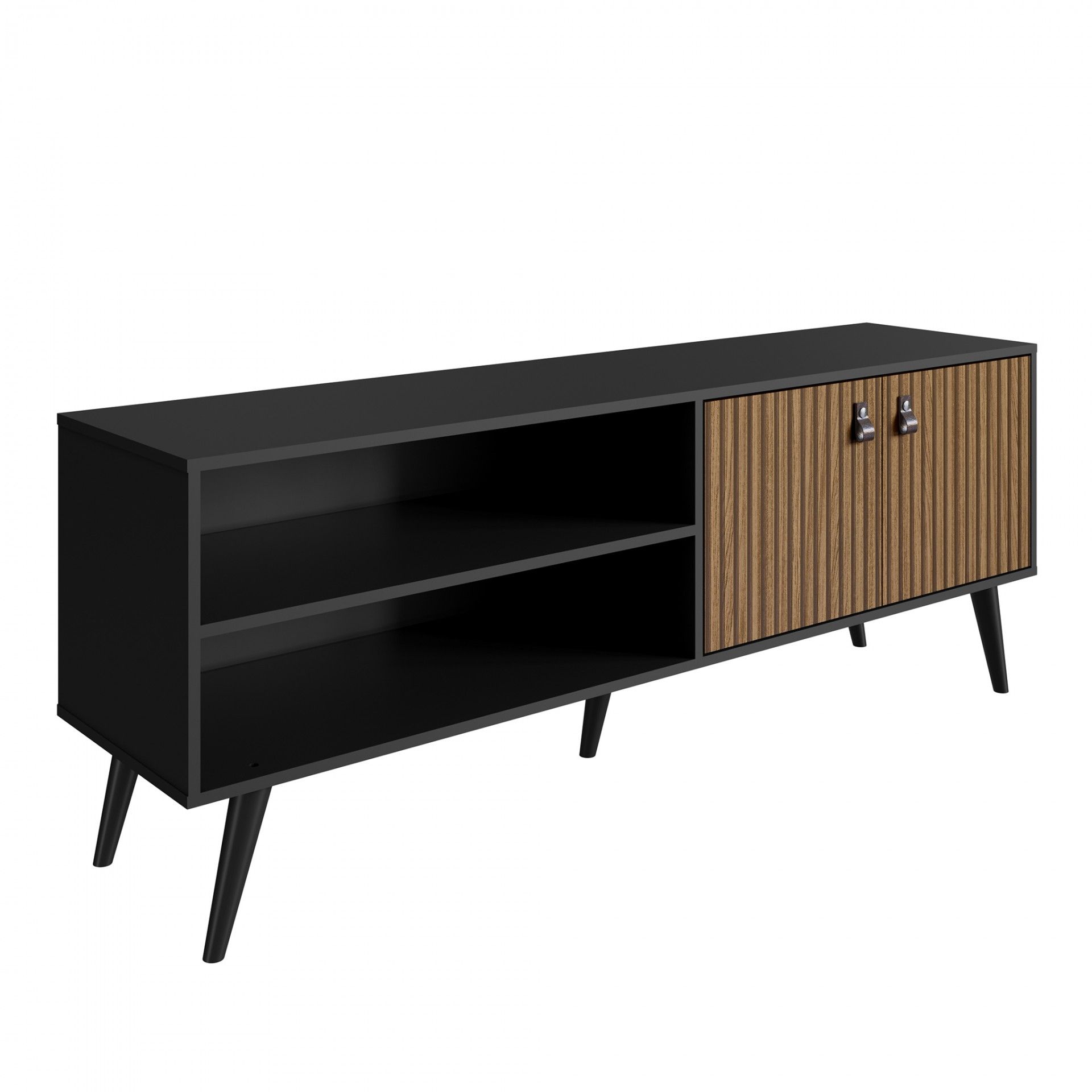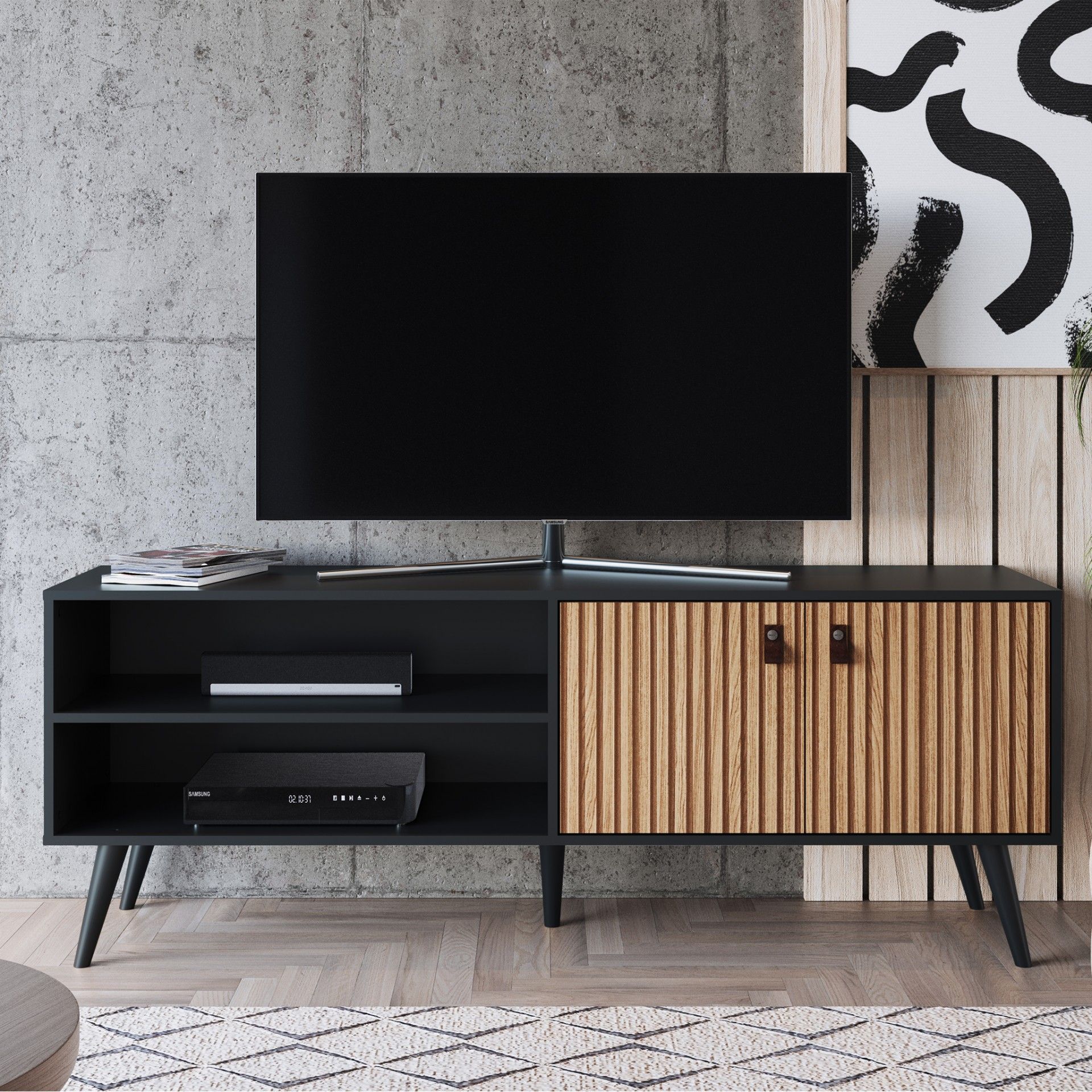 Móvel TV Odense com 180 cm de largura, ideal para TVs até 65”. Fabricado em aglomerado termoprensado, oferece nichos abertos e porta basculante para arrumação. Design moderno, funcional e com entrega em até 10 dias.
