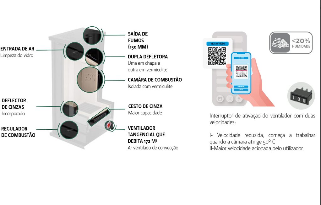 Além disso, o equipamento dispõe de entrada de ar exterior (Ø 80 mm) e regulador de combustão, que permitem uma queima mais precisa e controlada.