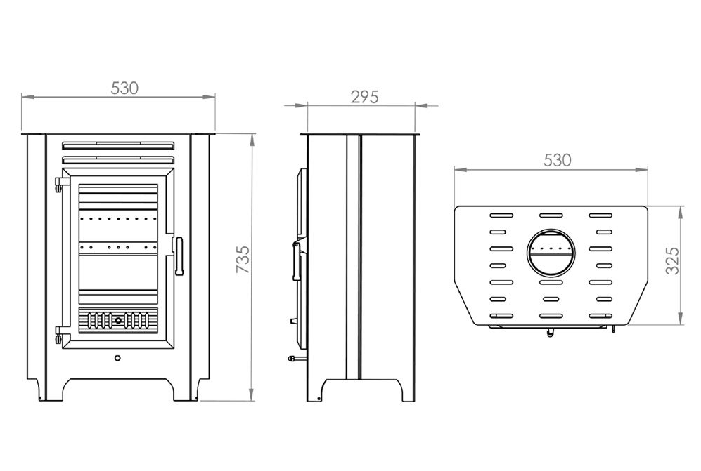 Medidas: L 53 x P 29,5 x H 73,5 cm | Saída de fumos: 12 cm | Peso: 70 kg