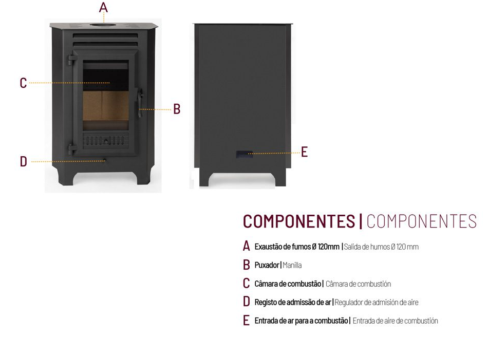 Entre as vantagens estão a dupla combustão, câmara revestida a vermiculite, entrada de ar exterior regulável e porta em ferro fundido. Funciona por convecção natural, sem ventilação, proporcionando calor uniforme e silencioso.