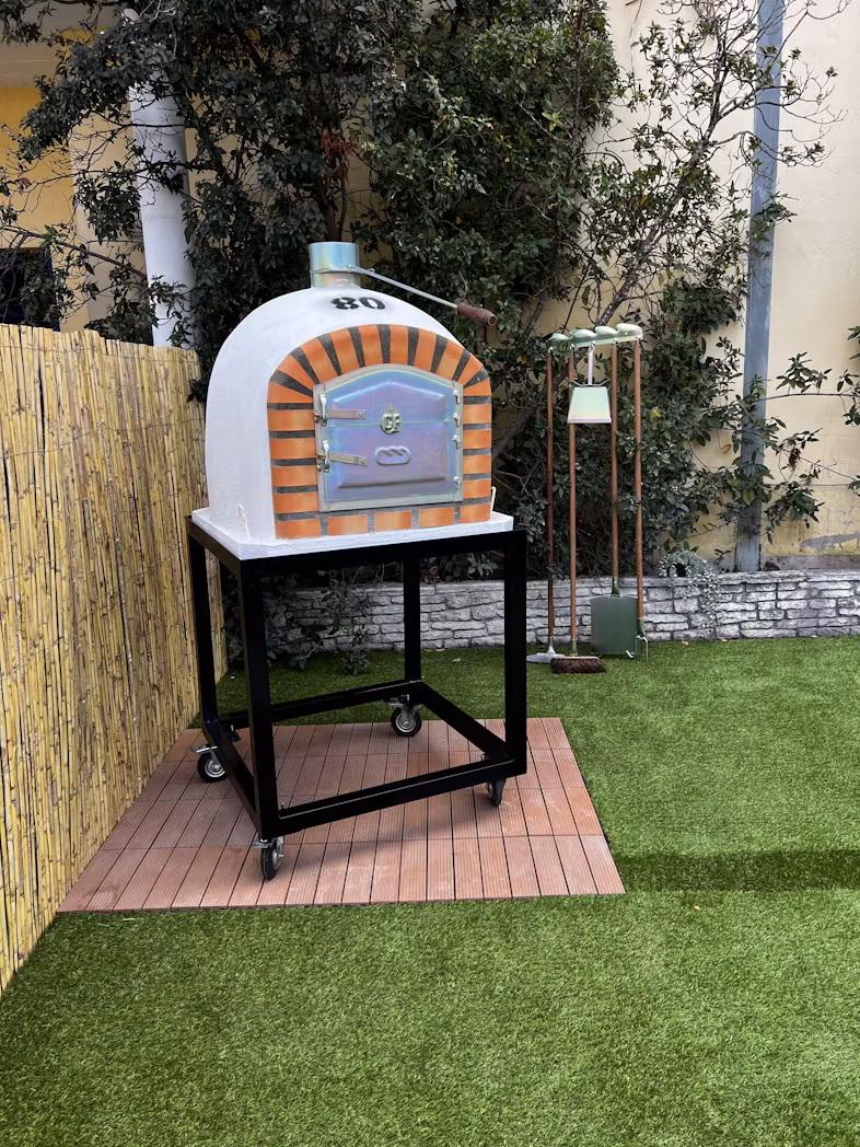 Disponível em três medidas — 80×80 cm, 100×100 cm e 120×120 cm —, o suporte adapta-se a diferentes modelos de fornos a lenha. Dessa forma, oferece total compatibilidade e estabilidade, independentemente do tamanho escolhido.